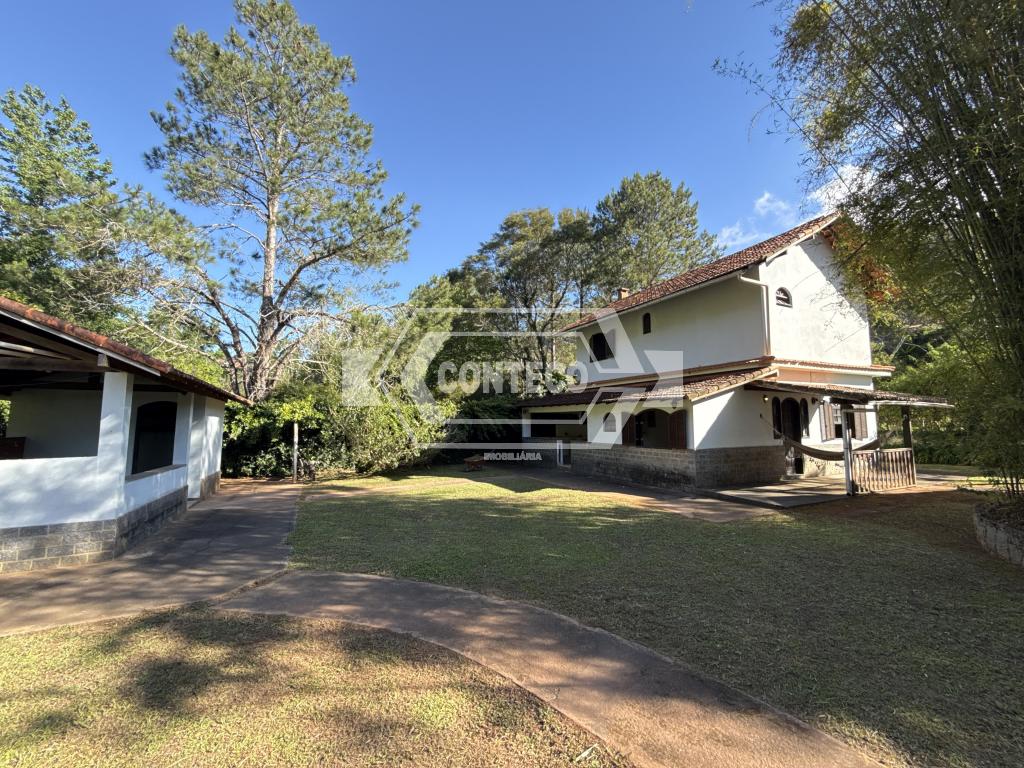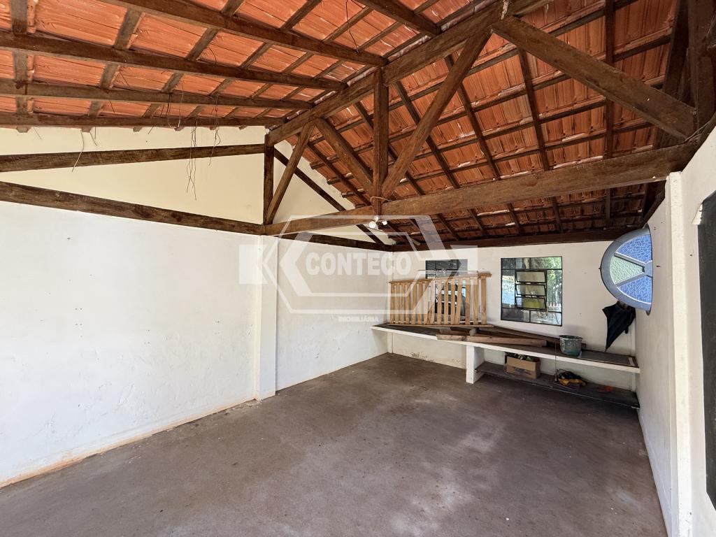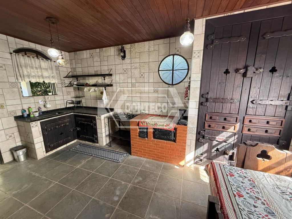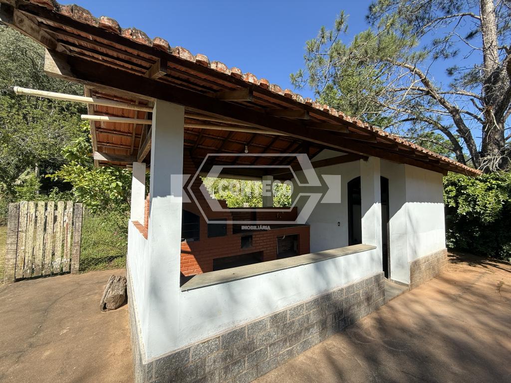 A área externa conta com espaço de churrasqueira, fogão a lenha e um quarto adicional, além de 3 canis, garagem coberta e uma agradável área ajardinada com gramado.