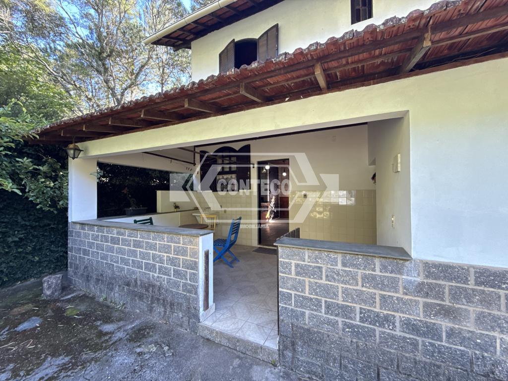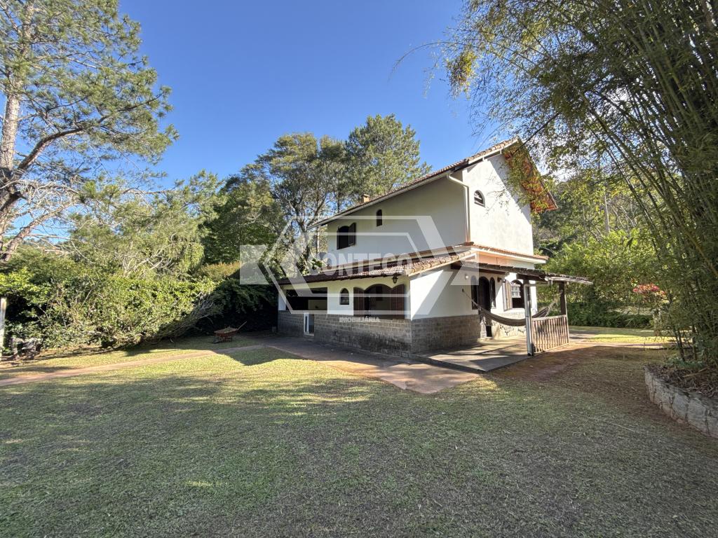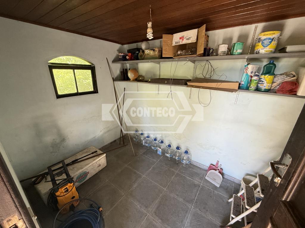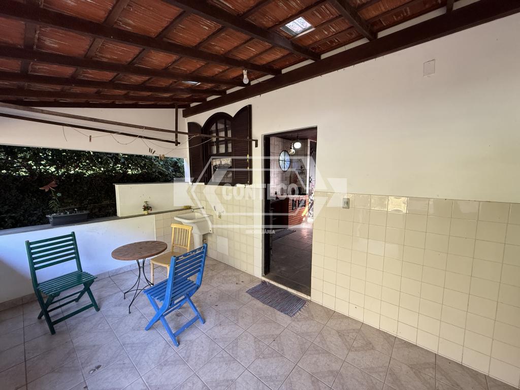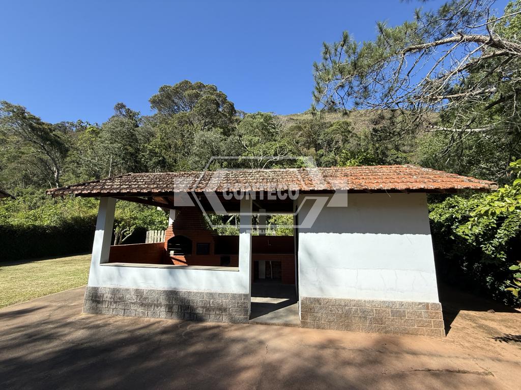 A área externa conta com espaço de churrasqueira, fogão a lenha e um quarto adicional, além de 3 canis, garagem coberta e uma agradável área ajardinada com gramado.